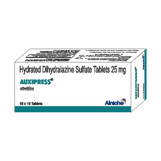 Auxipress contains Hydrated Dihydralazine Sulfate, a potent vasodilator that relaxes blood vessel smooth muscle, reducing peripheral vascular resistance and lowering blood pressure. This improves blood flow, eases the heart’s workload, and enhances the delivery of oxygen and nutrients to organs, benefiting patients with hypertension and chronic heart failure. By dilating blood vessels, Auxipress effectively helps manage high blood pressure and reduces cardiovascular strain.