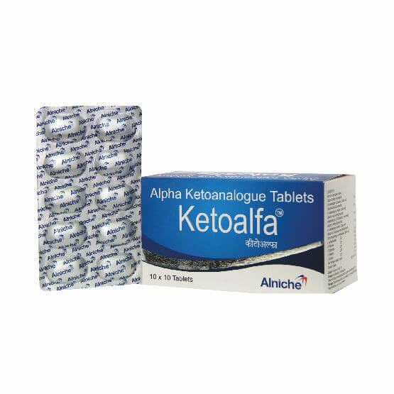 Ketoalfa contains alpha ketoanalogues of essential amino acids, designed for the nutritional management of patients with chronic kidney disease (CKD) on conservative therapy (Stages I–III). These ketoanalogues utilize endogenous nitrogen to form essential amino acids, thereby maintaining nitrogen balance and reducing urea generation in uremic patients.